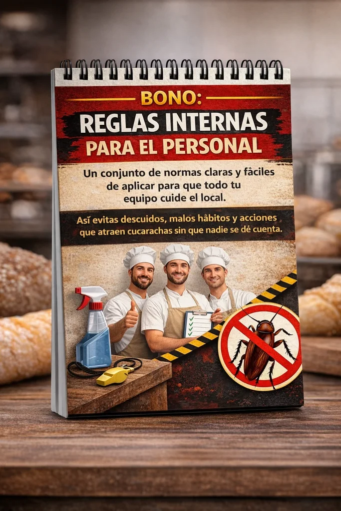 Sí. El protocolo está diseñado específicamente para negocios de alimentos como panaderías y reposterías. No es teoría ni consejos genéricos: es un plan paso a paso para actuar desde las primeras horas y cortar el problema antes de que crezca.